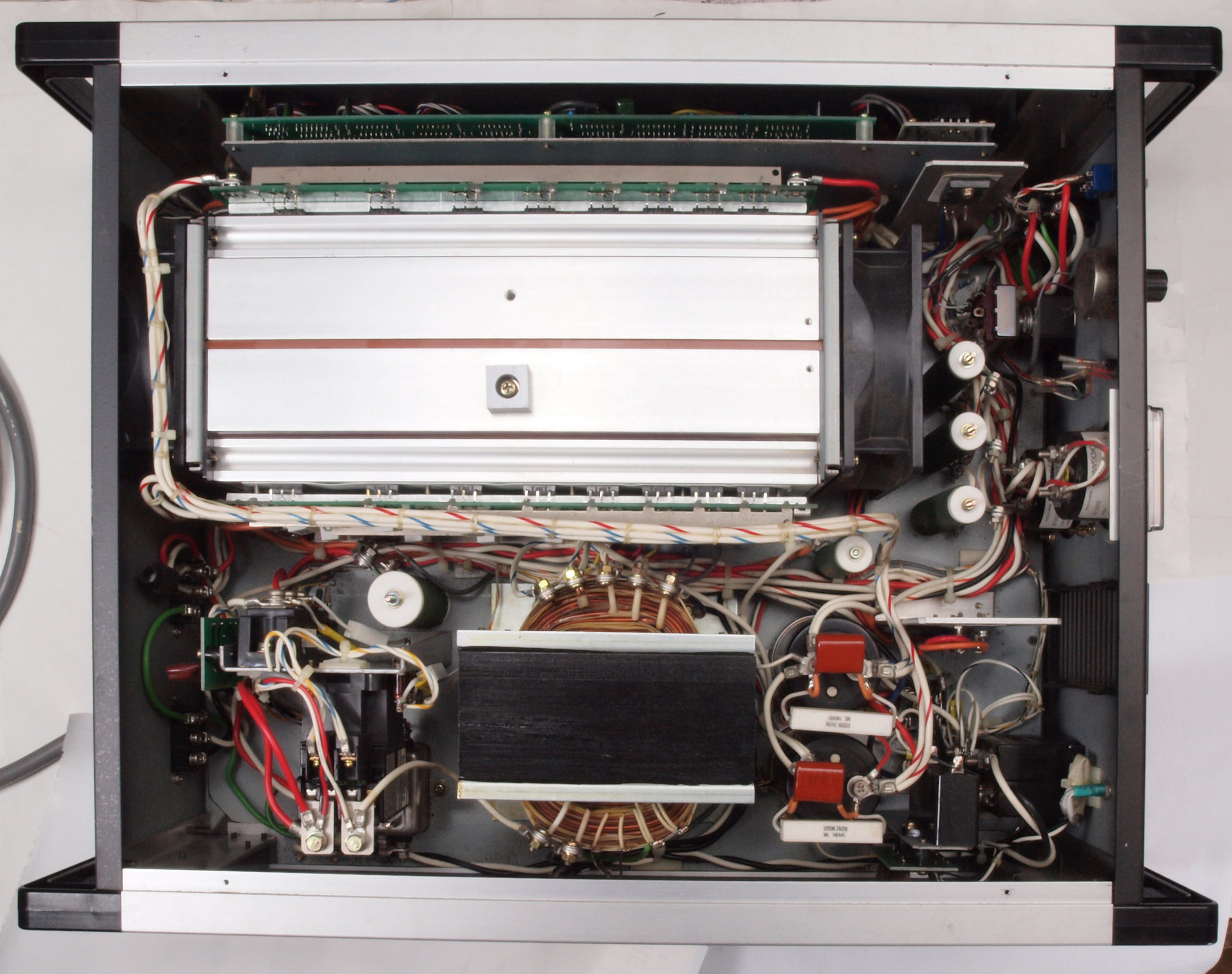 B5. 上蓋を取り、上から見る。フイルムコンデンサー2個、冷却フアンコントロールサーモ2個追加。