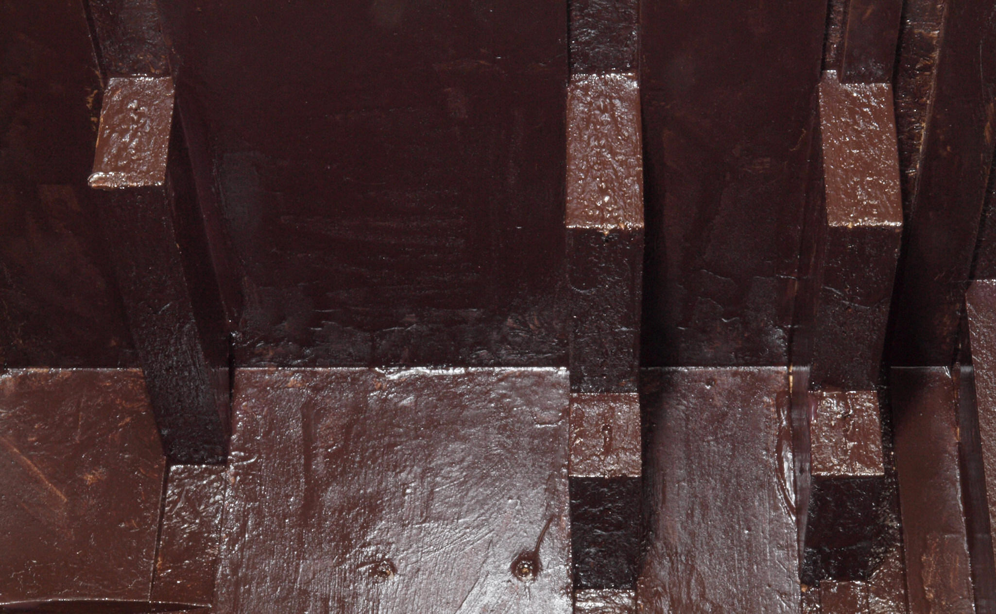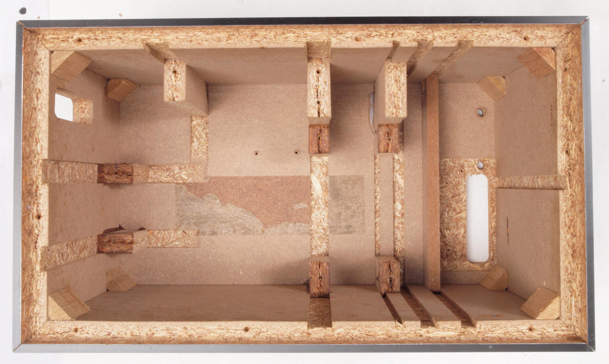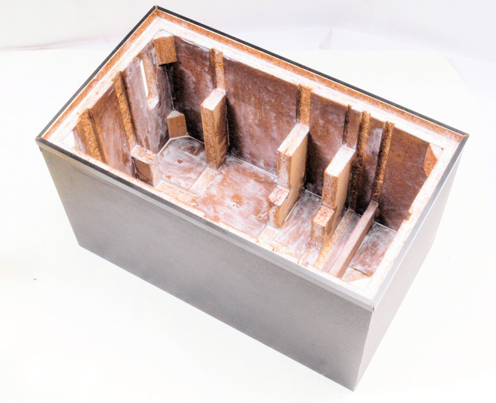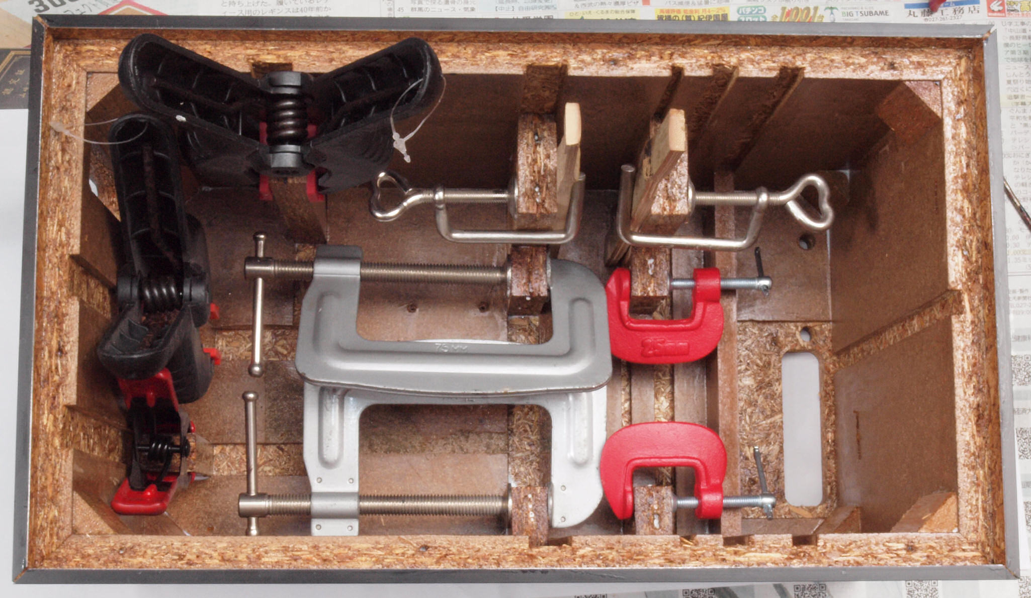 C48. 修理中 接着材が劣化した木箱、下後左から見る。圧縮板にボンドを塗って固めている。