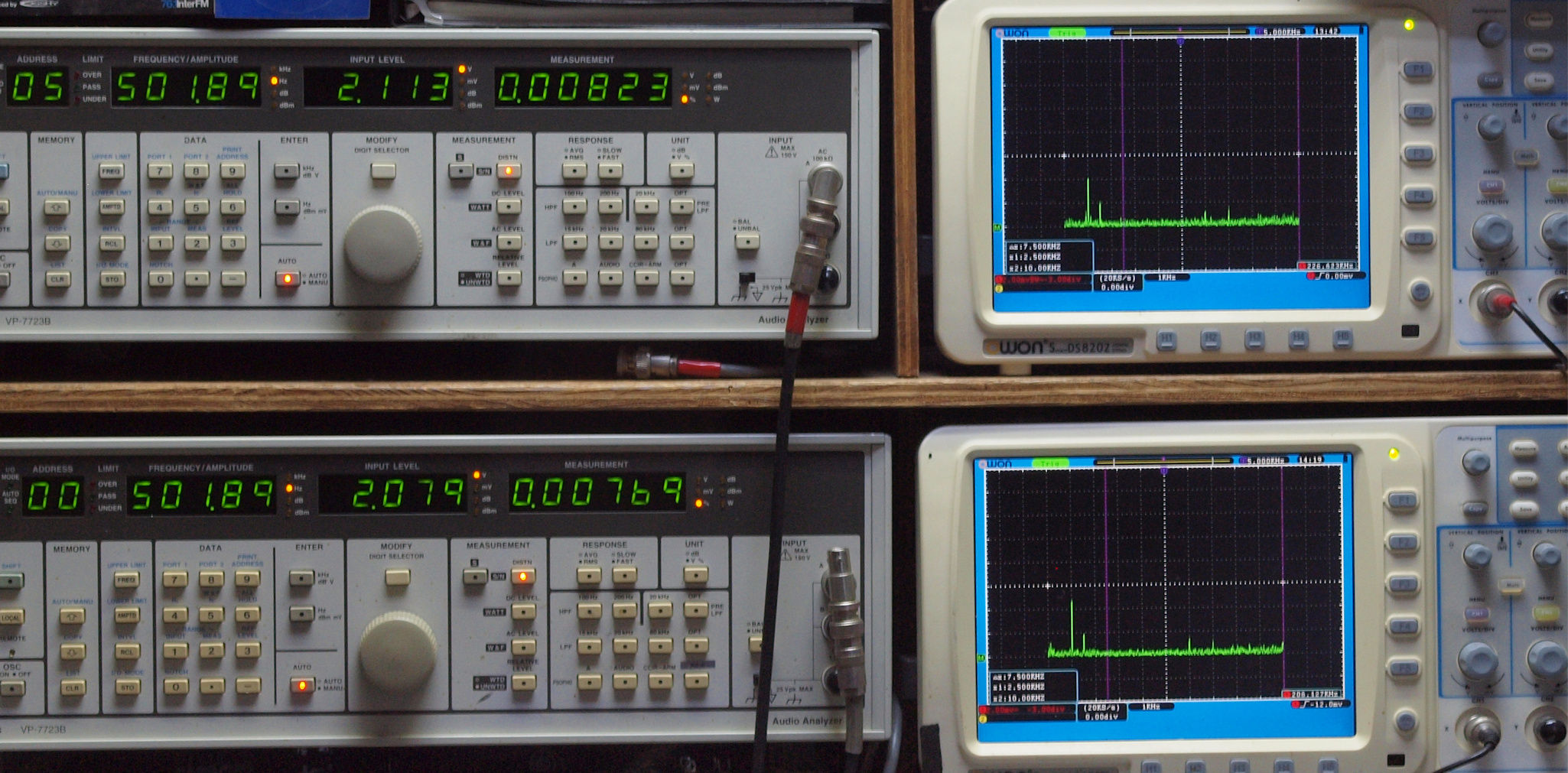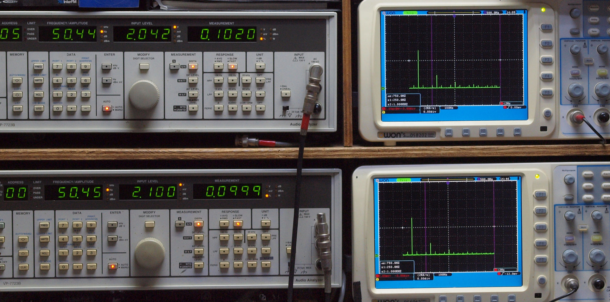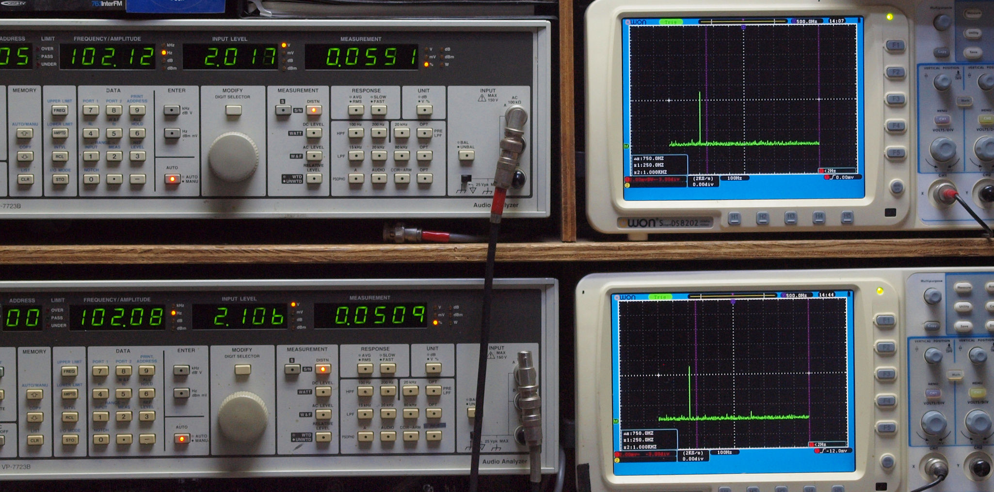 上段右端 VP−7723Bの基本波除去出力を「owon SDS8202(200MHZ)」で「FFT分析」表示。