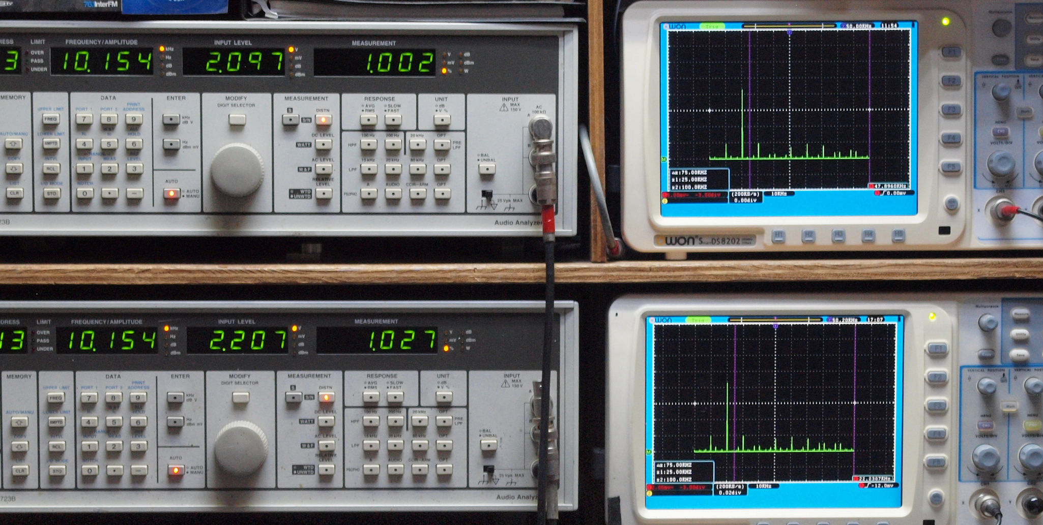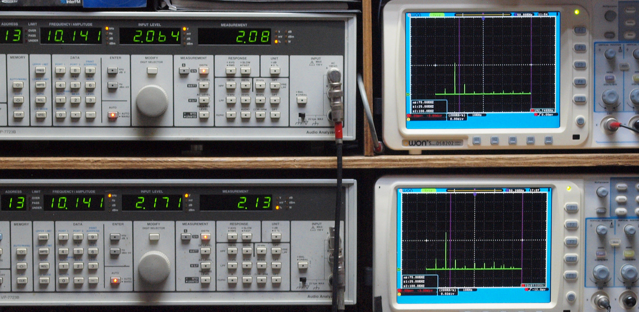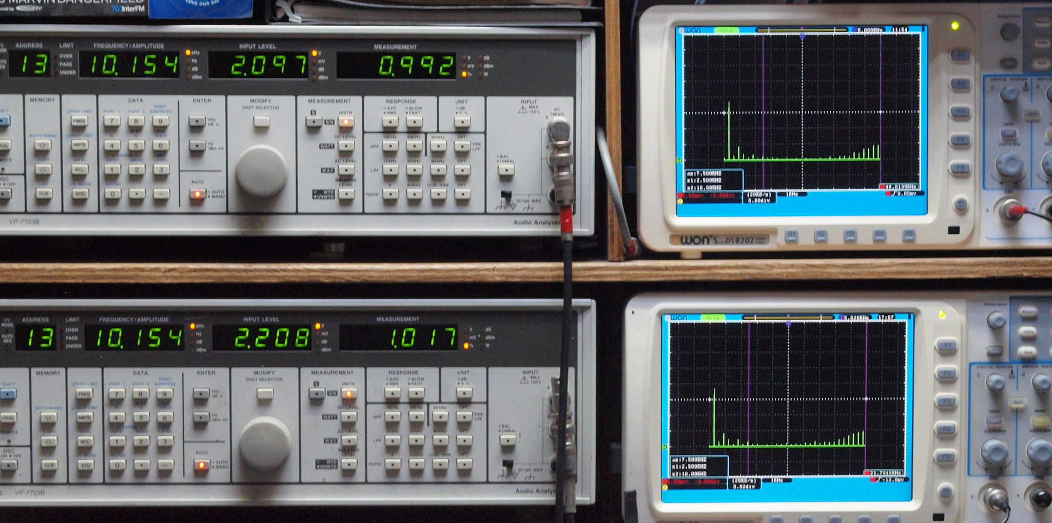 上段右端 VP−7723Bの基本波除去出力を「owon SDS8202(200MHZ)」で「FFT分析」表示。